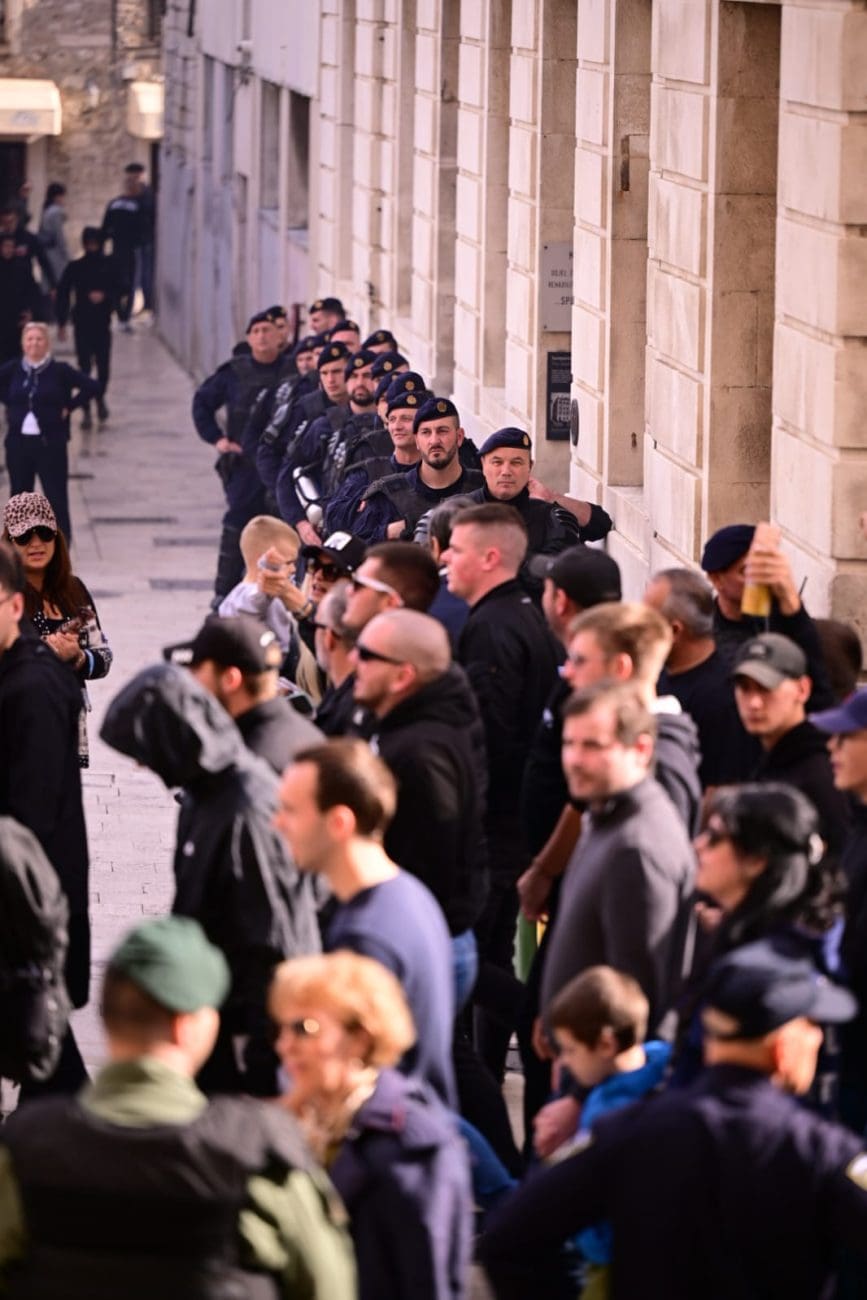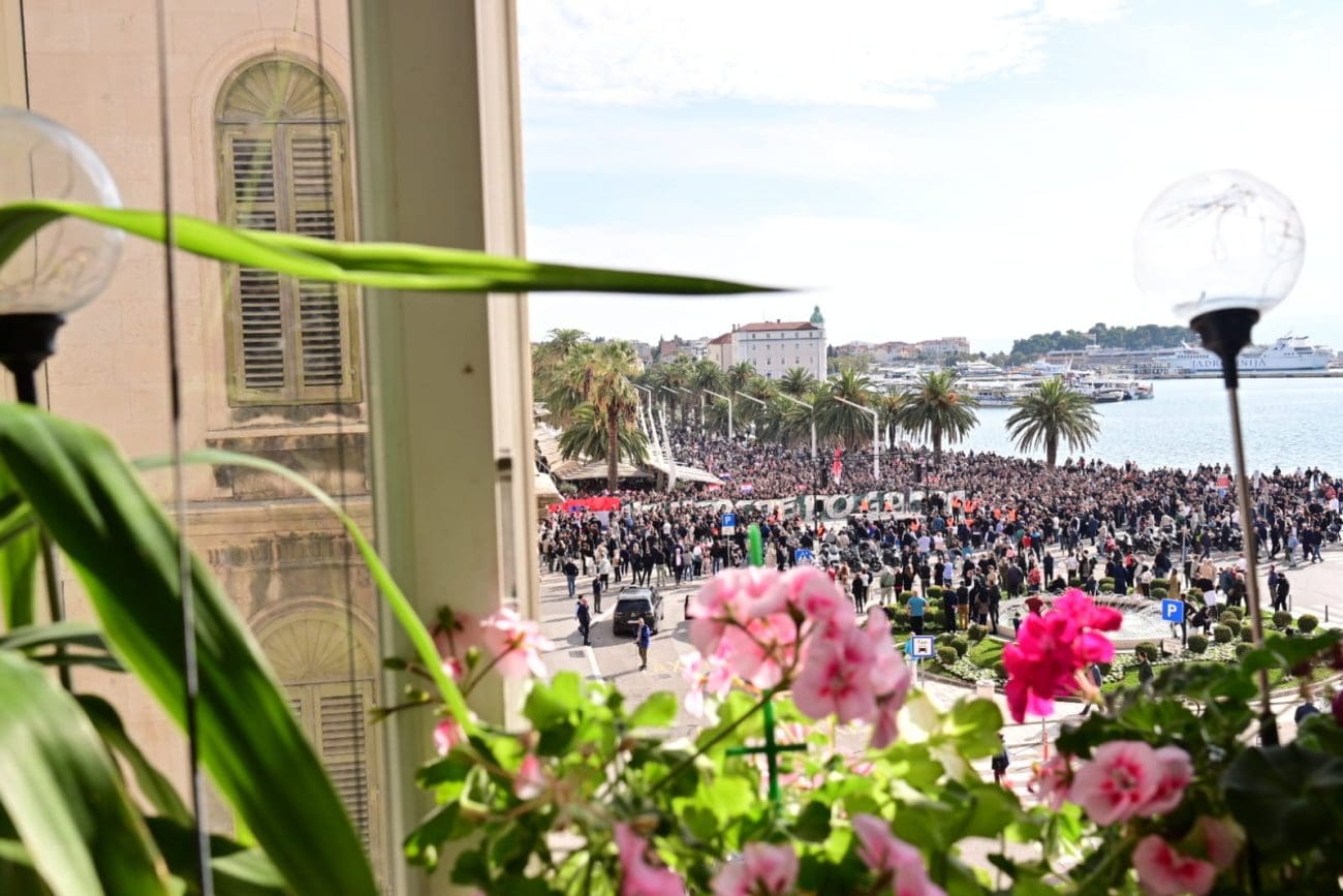 Prosvjednici su se zatim formirali u kolonu i krenuli prema sudu uz povike „Za dom spremni“ i pjesmu „Bojna Čavoglave“, dok su ih okupljeni prolaznici snimali i bodrili s obližnjih terasa.