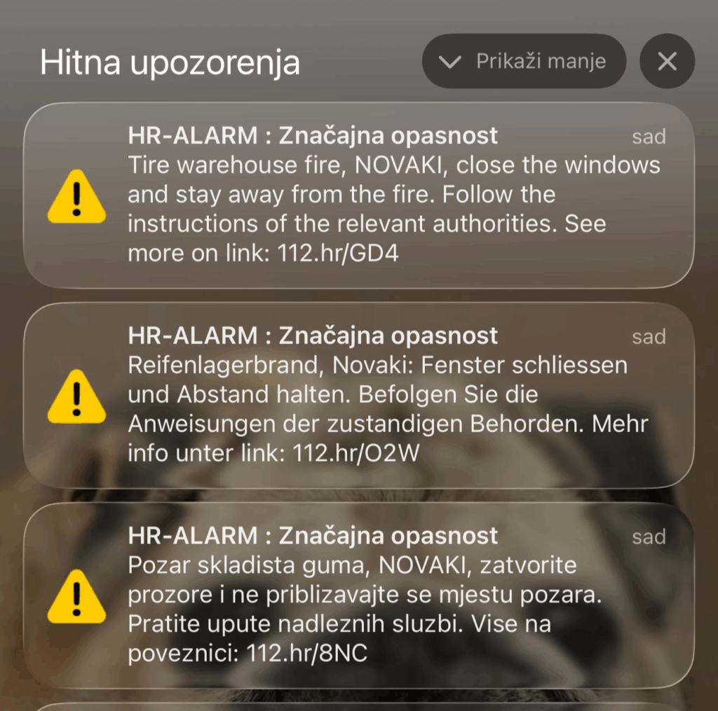 13:50 – Zagrepčanima i stanovnicima u okolici Zagreba stigla je poruka na mobitele uz glasan alarm: “Zatvorite prozore, ne približavajte se mjestu požara”. “Požar skladišta guma, NOVAKI, zatvorite prozore i ne približavajte se mjestu požara. Pratite upute nadležnih službi”, stoji u poruci.