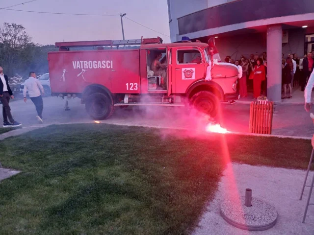 Mladenci su na taj način spojili ljubav i profesiju, a dolazak u vatrogasnim kolima bio je prava atrakcija za sve prisutne, koji su ih nagradili pljeskom i čestitkama.