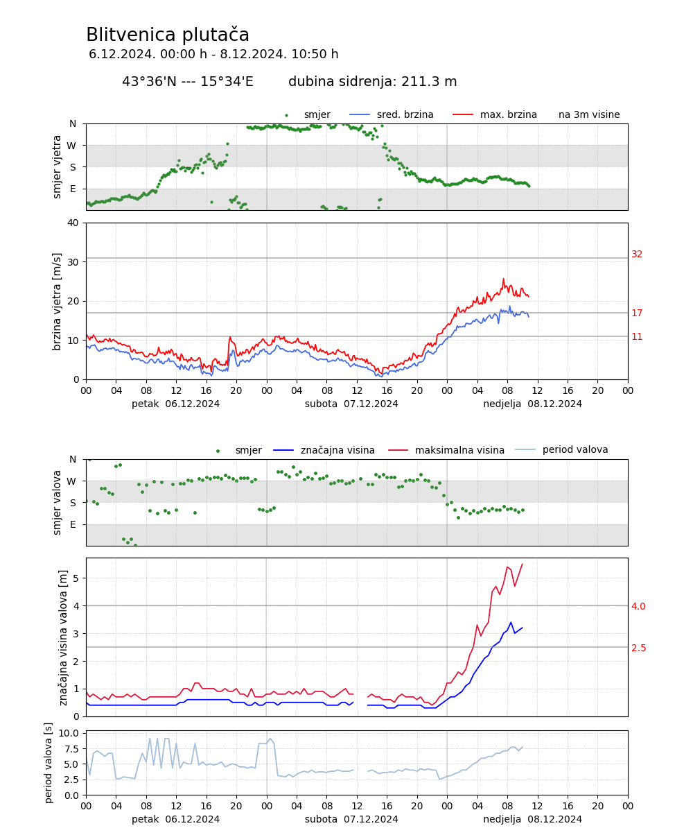 Na otvorenom moru situacija je još ozbiljnija. Meteorološka plutača kod otočića Blitvenica, jugozapadno od Žirja, bilježi značajnu visinu valova od 3.5 metara, dok najviši valovi dosežu čak 5.5 metara. Istodobno, vjetar puše olujnim intenzitetom, dodatno otežavajući uvjete na moru.