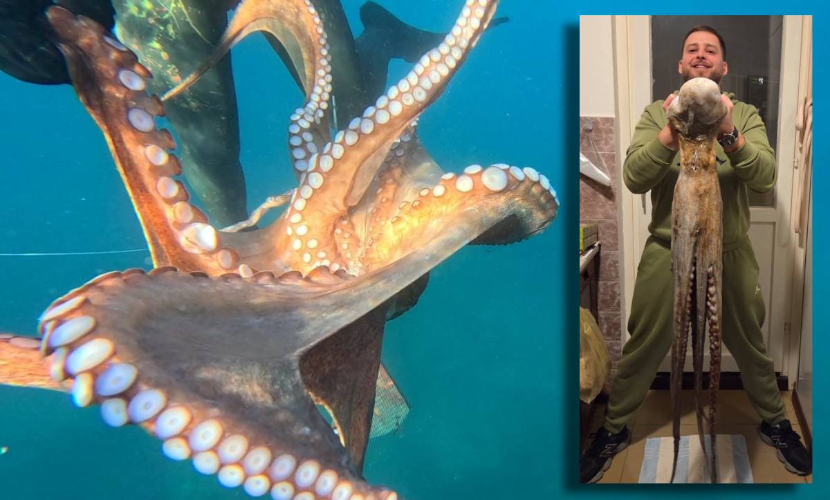 HVAR – Podvodni ribolovac Ante Klobučar iz Splita jučer je došao na svoju skrovitu poštu i posrećilo mu se. Naletio je na hobotnicu veliku gotovo kao i on sam, a visok je, kaže, 181 cm.