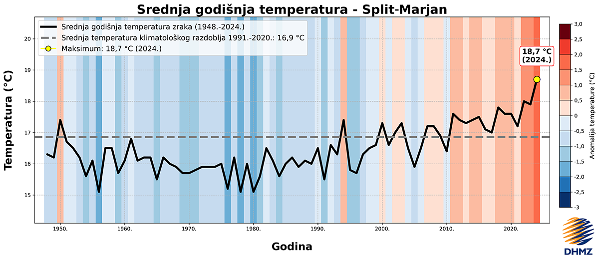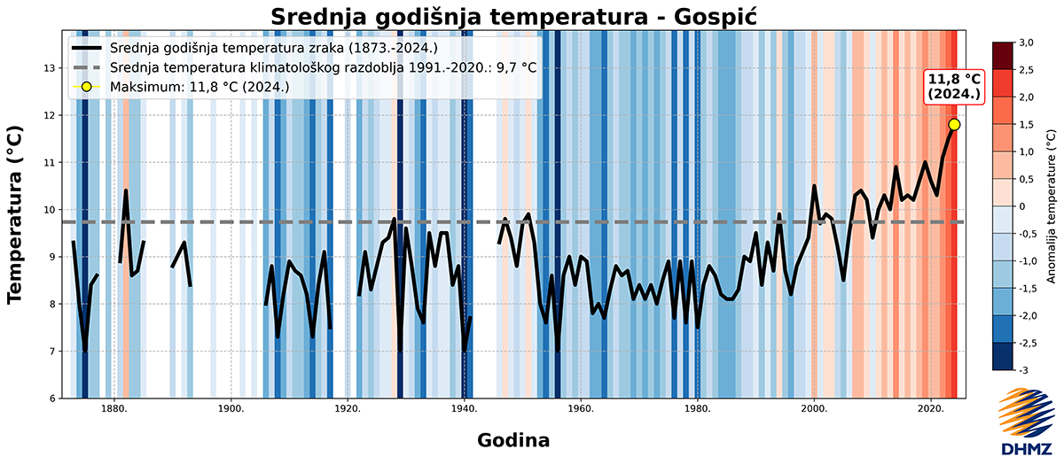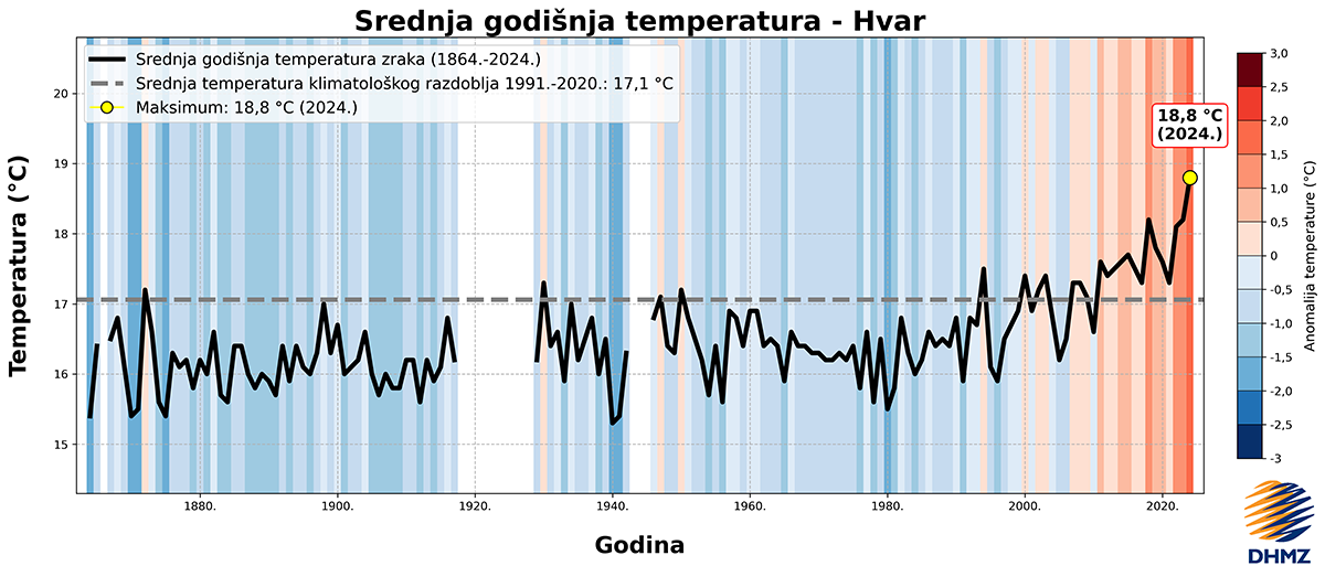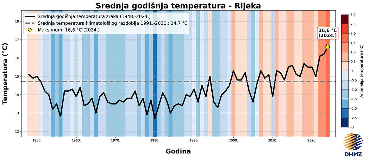 Nažalost, 2024. godina bila je i u Hrvatskoj najtoplija godina otkad postoje mjerenja. Na službenoj stranici inicijative Show Your Stripes dostupni su i grafički prikazi za Hrvatsku i Zagreb (za sada do 2023. godine). DHMZ je izradio, po uzoru na Show Your Stripes, grafike za sedam meteoroloških postaja: Osijek, Zagreb-Maksimir, Zagreb-Grič, Rijeka, Gospić, Split-Marjan i Hvar, za razdoblje od početka mjerenja do 2024. Kao referentno klimatološko razdoblje korišteno je razdoblje 1991. – 2020.