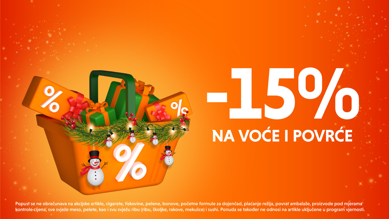 *Popust se ne obračunava na akcijske artikle, cigarete, tiskovine, pelene, bonove, početne formule za dojenčad, plaćanje režija, povrat ambalaže, proizvode pod mjerama kontrole cijena, sve svježe meso, pelete, kao i svu svježu ribu (ribu, školjke, rakove, mekušce) i sushi. Ponuda se također ne odnosi na artikle uključene u program vjernosti.