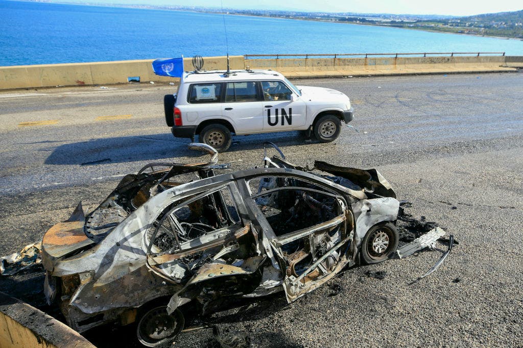 Patrola UNIFIL-a prolazi pokraj olupine automobila koji je bio meta izraelskog napada rano 2. ožujka 2024. u blizini južnog libanonskog grada Naqoura. (AFP preko Getty Images)