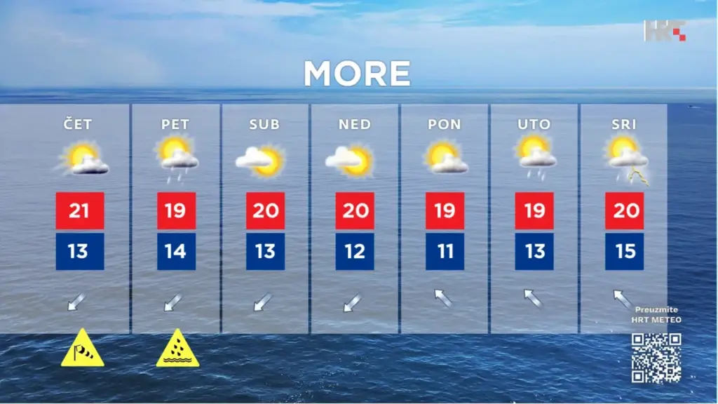 Na Jadranu će se već u subotu razvedriti, a vikend će proteći uz pretežno sunčano i ugodno toplo vrijeme. U ponedjeljak će s promjenom vjetra na jugo ponovno pristizati oblaci, ali bez značajnijih oborina.