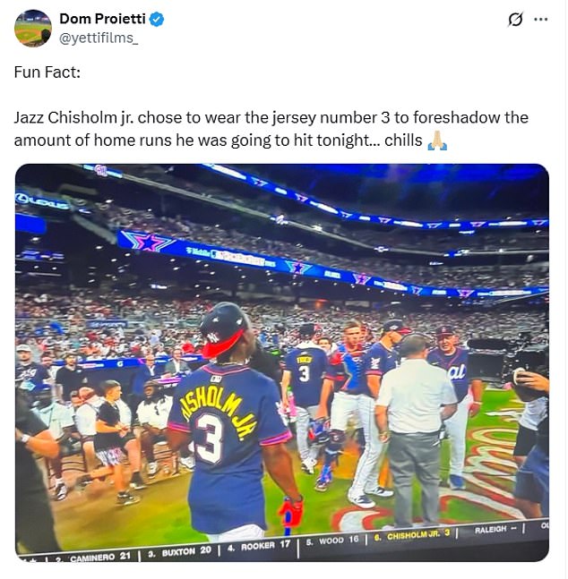“Zabavna činjenica: Jazz Chisholm Jr. odlučio je nositi Jersey broj 3 kako bi predvidio količinu domaćih trčanja koje će večeras pogoditi … hladno”, našalio se jedan korisnik na X.