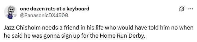 “Jazz Chisholm treba prijatelja u svom životu koji bi mu rekao ne kad bi rekao da će se prijaviti za derbi iz domaćeg trčanja”, našalio se drugi.