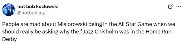 “Ljudi su ljuti (Rookie Milwaukee Brewers Jacob) Misiorowski u igri All Star -a kad bismo se zaista trebali pitati zašto je F Jazz Chisholm bio u derbiju domaćeg trčanja”, navodi se još jedan račun.