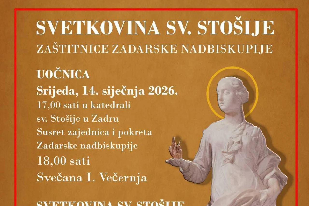 2. Na uočnicu proslave sv. Stošije, zaštitnice Zadarske nadbiskupije i naslovnice zadarske katedrale, Svečanu Večernju u katedrali sv. Stošije u Zadru s početkom u 18 sati predvodi zadarski nadbiskup Milan Zgrablić.