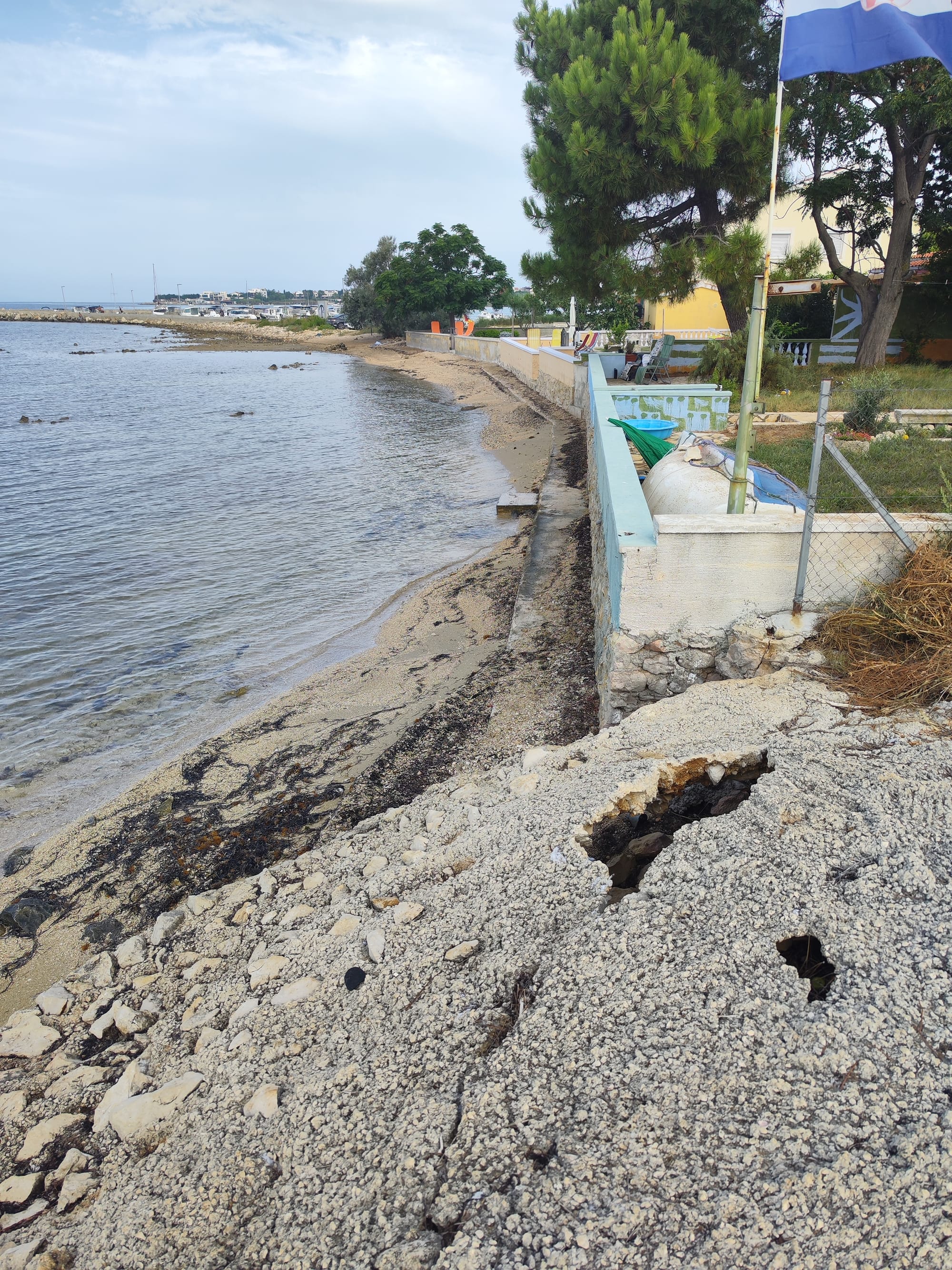 2) su sagradili ograde skroz do mora i proširili dvorišta. Izgleda da su se preračunali i sada im nedostaje plaže pa si nasipaju šljunak. Vide se hrpe šljunka ispred jednog ulaza. Na izvatku izgleda kao da imaju par kvadrata ispred kuće. Naravno da ostavljaju ležaljke, ali to je najmanji problem. Ovaj “put” ispred ograda je pod vodom za vrijeme jače plime.