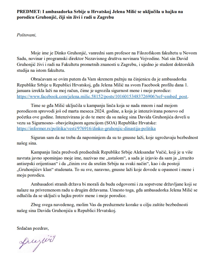 “Obraćavam se ovim putem da Vam skrenem pažnju na činjenicu da je ambasadorica Republike Srbije u Republici Hrvatskoj, gđa Jelena Milić na svom Facebook profilu dana 1. siječnja izrekla laži na moj račun, čime je ugrozila sigurnost mene i moje porodice”, napisao je Gruhonjić u pismu Plenkoviću, Milanoviću i Grliću Radmanu. “Time se gđa Milić uključila u kampanju linča koja se nada mnom i nad mojom porodicom provodi još od ožujka 2024. godine, a koja je intenzivirana ponovo od početka ove godine. Intenzivirana je do te mjere da su našeg sina Davida Gruhonjića doveli u vezu sa Sigurnosno- obavještajnom agencijom (SOA) Republike Hrvatske. Siguran sam da ne trebam napominjati da su to gnusne laži, koje ugrožavaju sigurnost našeg sina“, dodao je.
