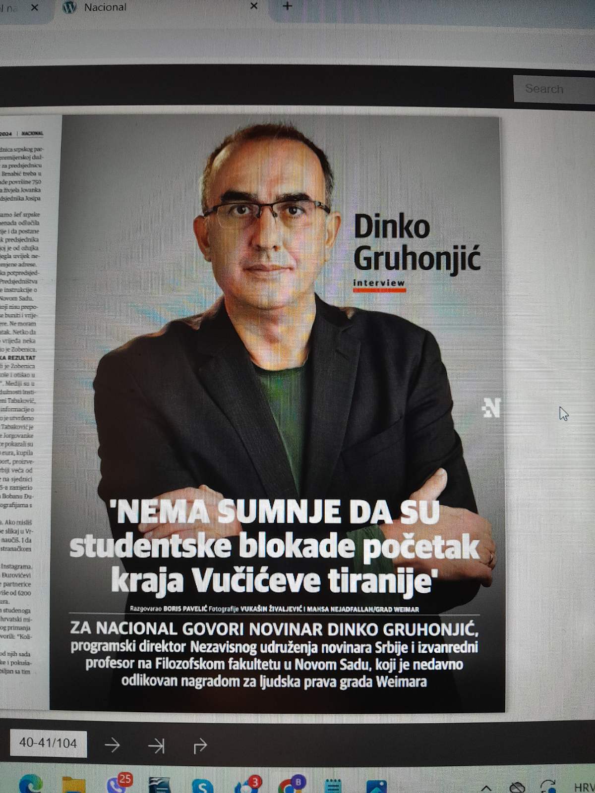 Dinko Gruhonjić je novinar, programski direktor Nezavisnog udruženja novinara Srbije (NDNV), izvanredni profesor Odsjeka za medijske studije Filozofskog fakulteta u Novom sadu i urednik vojvođanskog dopisništva novinske agencije Beta. Posljednjih mjeseci, zajedno sa skupinom kritički raspoloženih novosadskih kolega, postao je neka vrst etičke okomice prosvjeda protiv autokratske vlasti Aleksandra Vučića, kojoj su Vojvodina i Novi Sad već godinama naročita meta u gušenju svakog alternativnog i demokratskog glasa. Gruhonjić osobno već je mjesecima meta kontinuirane kampanje mržnje režimskih televizija i tabloida u Srbiji. Nacional je u svom posljednjem broju s Dinkom Gruhonjićem razgovarao o aktualnim blokadama fakulteta u Srbiji koje potiču sve snažniji građanski otpor Vučićevu režimu.