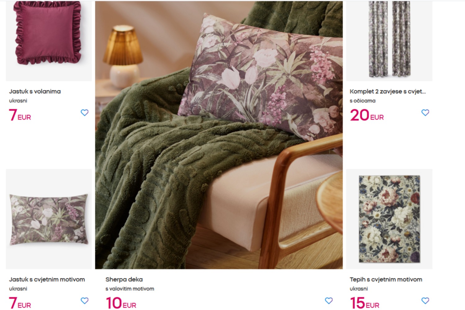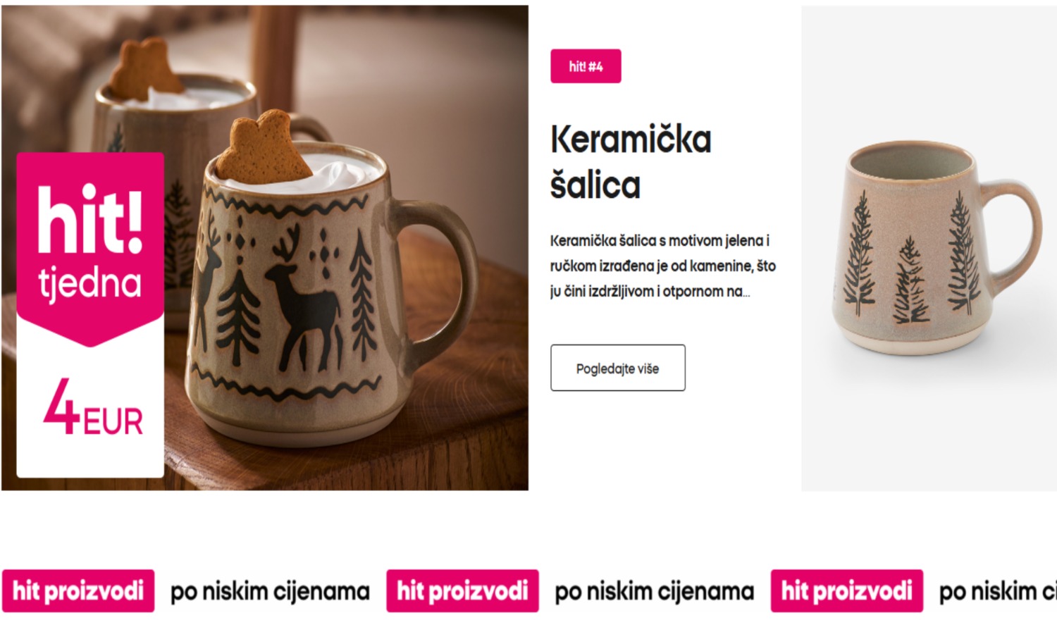 Keramičke šalice s motivom jelena i ručkom izrađena od kamenine košta 4, dok se jastuci prodaju po 5, a deke s istim dizajnom po 12 eura. Sherpa deke s valovitim motivom su 2 eura jeftinije.
