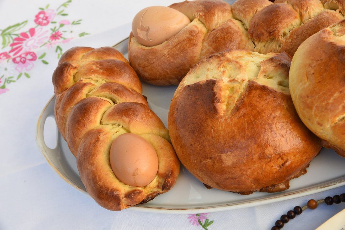 Prosijati brašno. U sredini napraviti rupicu u koju se stave sva žumanjca i pola bjelanjaka, šećer, mast, sol i korica od limuna i naranče, vanilija i rožolj. Dodati kvasac koji je prije rastopljen u 1 dcl mlakog mlijeka s malom žlicom šećera. Sve dobro izraditi. Umotati u krpu i pustiti na toplo da uskisa. Kad je dovoljno uskisalo, tijesto podijeliti na tri dijela, oblikovati pogače i pustiti da opet kisaju. Kad su uskisale, škarama lagano prerezati po površini i namazati tučenim jajem. Peći na laganoj vatri oko 40 minuta. Napomena: Za pogače je važno da se sve radi u toplom.
