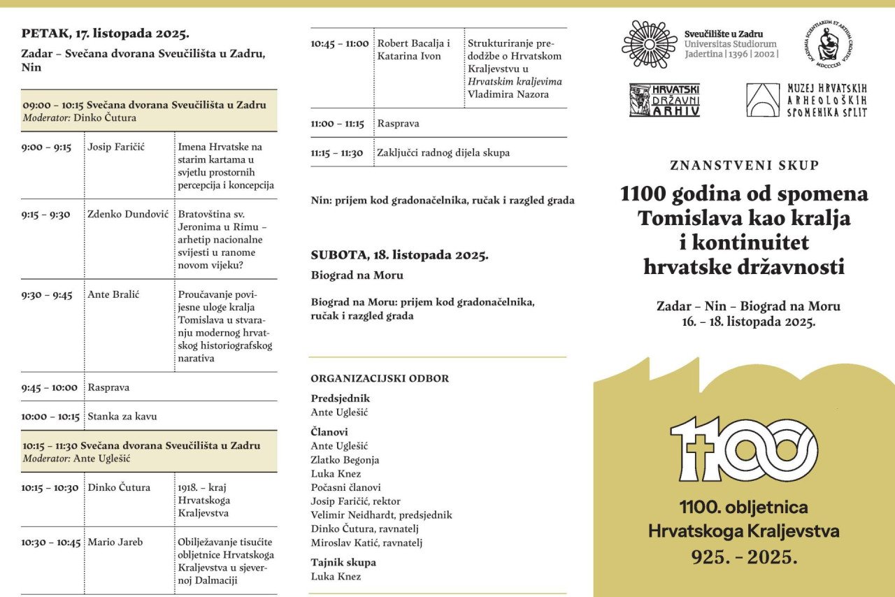 Sveučilište u Zadru, u suradnji s Hrvatskom akademijom znanosti i umjetnosti, Hrvatskim državnim arhivom i Muzejom hrvatskih arheoloških spomenika, najavljuje znanstveni skup „1100 godina od spomena Tomislava kao kralja i kontinuitet hrvatske državnosti“, koji će se održati od 16. do 18. listopada u Zadru, Ninu i Biogradu na Moru.