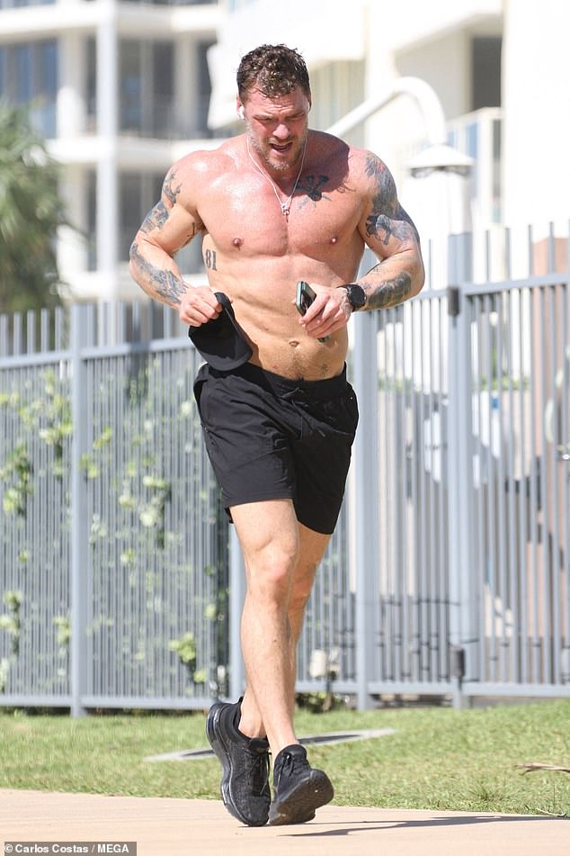 Alanova tonirana tjelesna tijela bila je na punom zaslonu dok je išao bez košulja zbog izleta, lepršavši svoj tetovirani torzo i biceps dok je držao tempo.