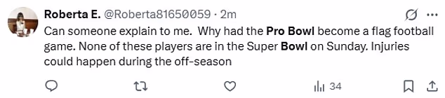 Treći je napisao: ‘Može li mi netko objasniti. Zašto je Pro Bowl postao nogometna igra zastave? Nijedan od ovih igrača nije u Super Bowlu u nedjelju. Ozljede bi se mogle dogoditi izvan sezone.’