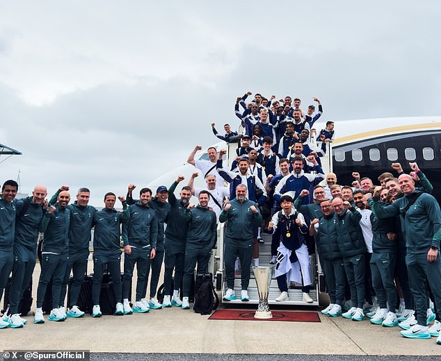 Tottenhamove zvijezde i osoblje okupili su se na grupnoj fotografiji sa svojom novom nagradom nakon što su se u četvrtak popodne sletjeli u Englesku – iako se jedan igrač istaknuo zbog kršenja pravila.